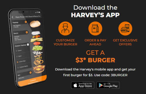 Download the Harveys mobile app and get your first burger for $3.00